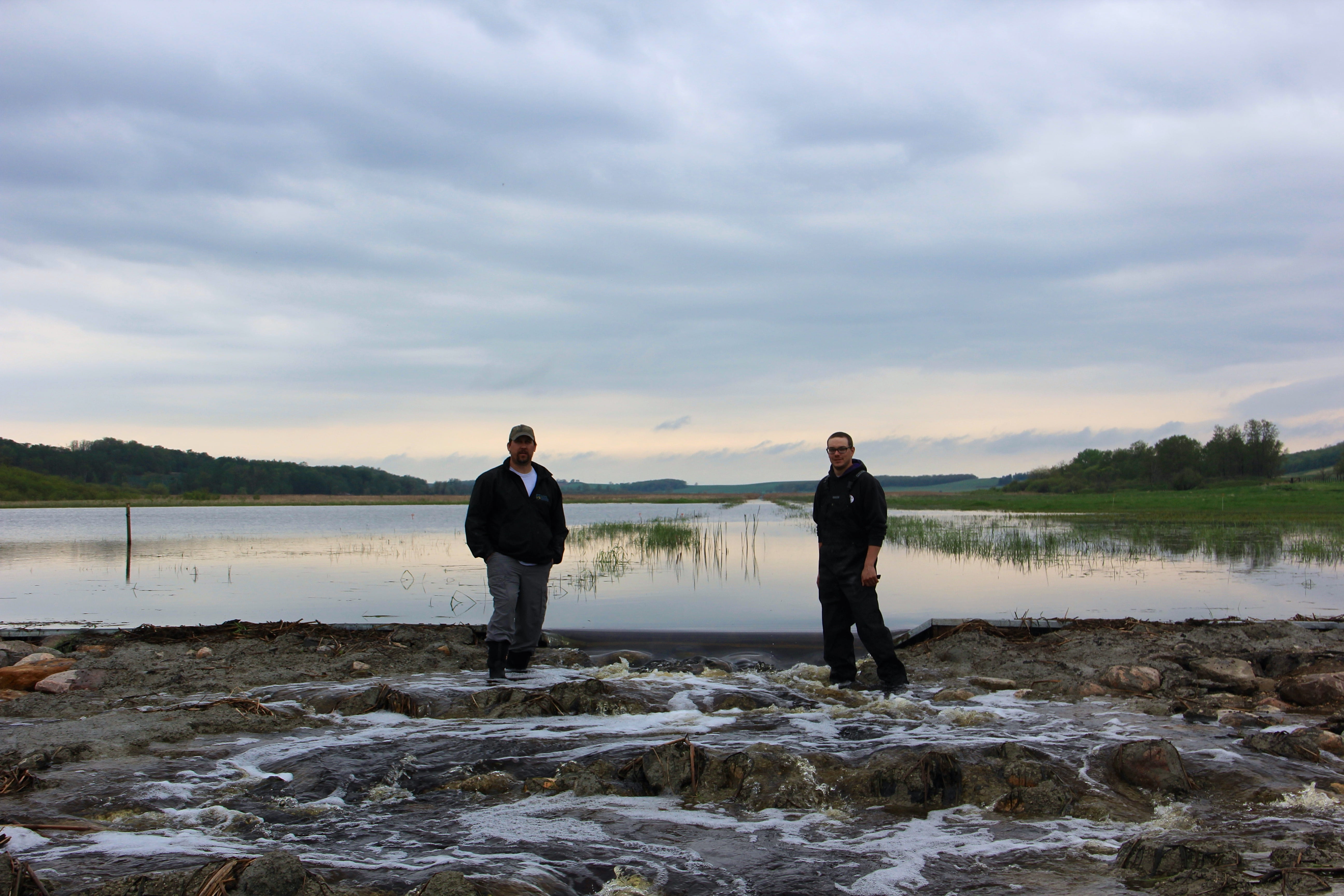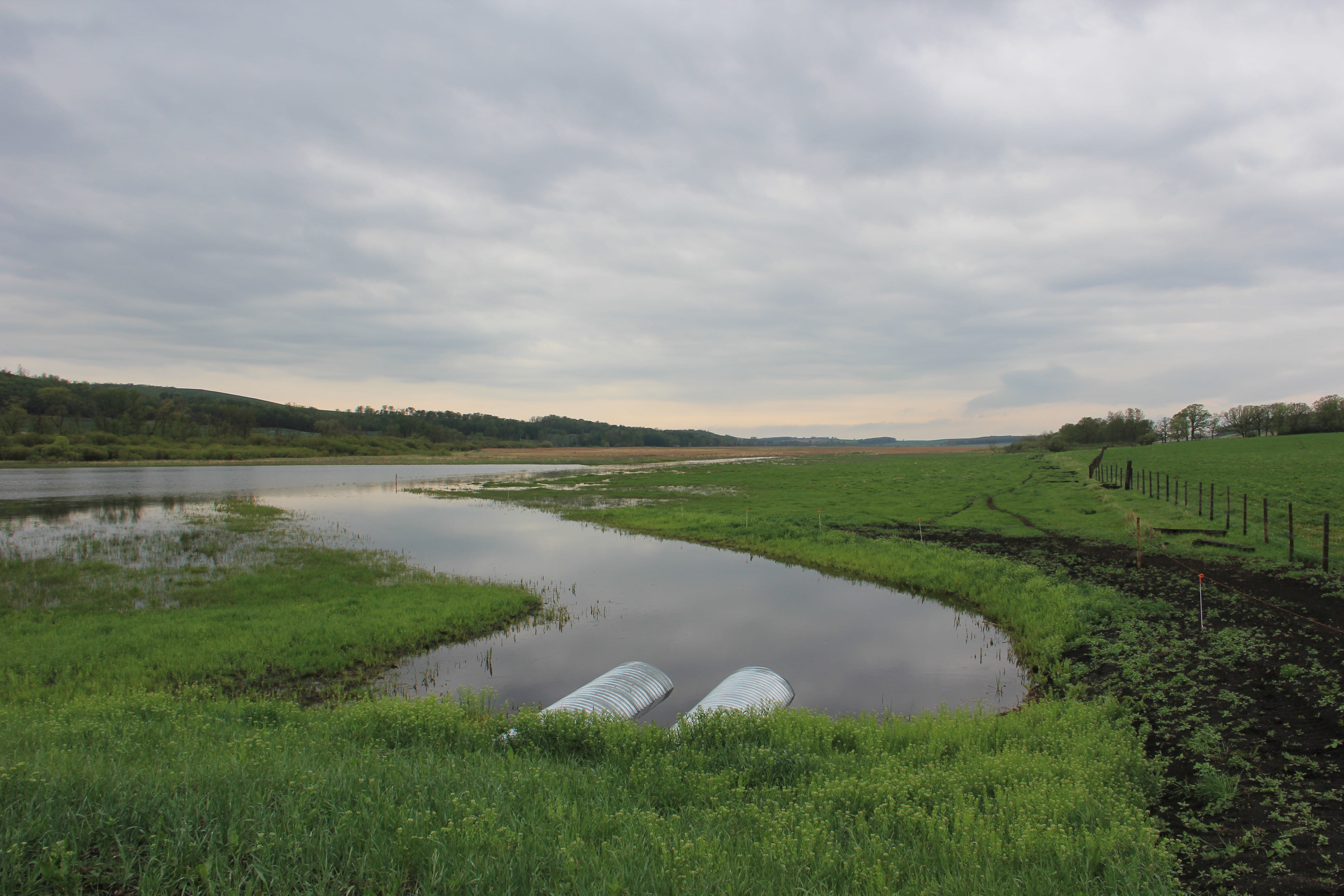 As part of Laura Blunden’s summer experience with the Watershed Systems Research Program (WSRP), she played an instrumental role in partnering with various stakeholders and was fortunate to attend the Manitoba Conservation District Association’s (MCDA) tour. The tour was held on June 16, 2015 by the LaSalle Redboine Conservation District for the Pelly’s Lake watershed management project. During the tour, conservation and municipal officials opened the culvert gates that released water held from spring melt at Pelly’s Lake. The LaSalle Redboine Conservation District built the Pelly’s Lake dam last year in collaboration with many landowners who donated portions of their property for the project. This initiative allows the valley to back flood and mimic how the water would naturally flow over the landscape over time. The slower flow reduces flooding, improves habitat protection, and allows for cattails to take up the phosphorous from the water. The water is held in Pelly’s Lake wetland as part of a water management strategy in which every year approximately 5,000 kg of phosphorous are prevented from draining into Lake Winnipeg through the use of cattails. The International Institute for Sustainable Development (IISD) performed a cattail harvesting demonstration during the tour where participants learned about the uses of harvested cattails, including transforming them into biofuels and soil amendment products; meaning farmers no longer have to import soil amendment products from such long distances. CTV was present on site to conduct a news report of the event, which can be seen here: http://winnipeg.ctvnews.ca/video?clipId=637306&playlistId=1.2425850&binId=1.1164782&playlistPageNum=1&fb_action_ids=10153468942578112&fb_action_types=og.shares